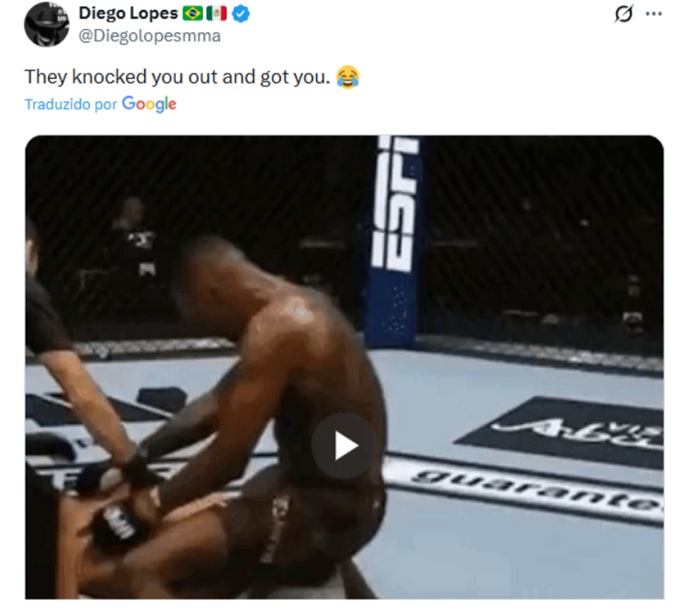 A resposta de Diego não demorou e veio no mesmo tom provocativo. O peso-pena recorreu a um momento icônico da carreira de Borrachinha – o nocaute sofrido para Israel Adesanya no UFC 253, em 2020 – e publicou o famoso gif da “sarrada” aplicada pelo nigeriano após a luta. Ao rebater a ironia, o manauara escreveu: “Eles te nocautearam e te pegaram (risos)”, devolvendo a alfinetada com uma referência que rapidamente foi lembrada pelos fãs.