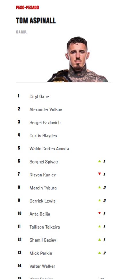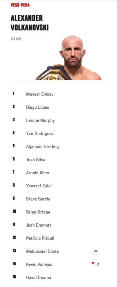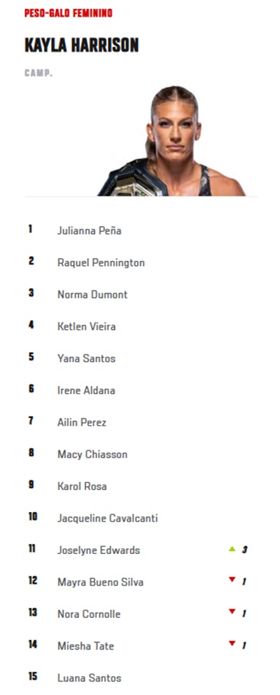 Outros destaques do UFC Houston também foram recompensados. Nos meio-médios, Uros Medic assumiu a 12ª colocação após nocautear Geoff Neal, que deixou a lista após anos entre os ranqueados. Já no peso-galo feminino, Joselyn Edwards subiu três posições e agora ocupa o 11º lugar, embalando sua melhor sequência na organização com quatro vitórias consecutivas.
