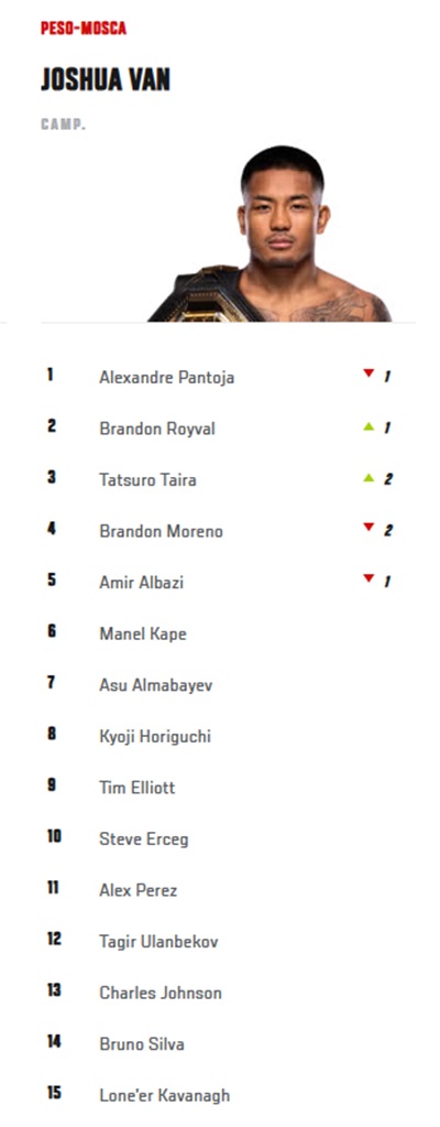 Pantoja, que ocupava a quinta posição do peso-por-peso antes do evento, acabou deixando o topo dos moscas após sofrer uma grave lesão com apenas 26 segundos de luta contra Joshua Van. O revés por nocaute técnico não apenas lhe custou o cinturão, como também provocou uma queda de quatro posições na classificação geral, levando-o ao nono lugar. Enquanto isso, Joshua Van, o novo campeão da divisão, fez sua estreia na lista figurando diretamente na 11ª posição, reflexo imediato de sua ascensão meteórica.