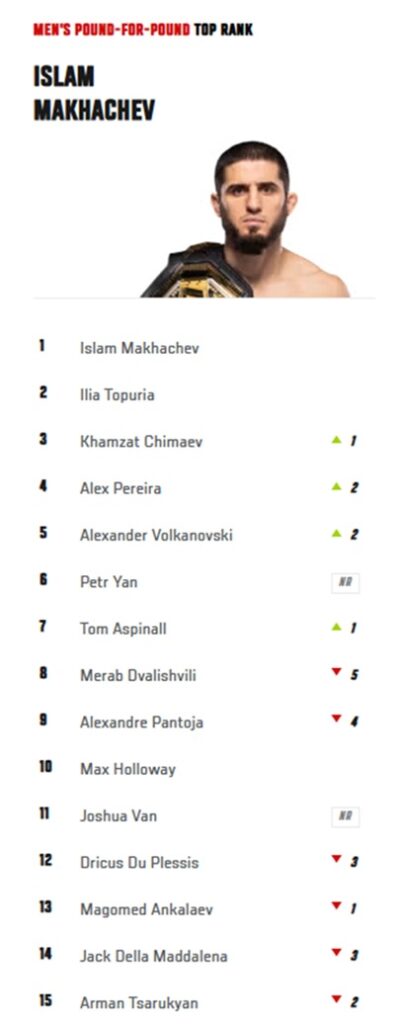 A dança das posições também alterou o cenário do top-5 peso por peso do UFC. Com as quedas de Merab e Pantoja, a elite da lista agora é comandada por Islam Makhachev, seguido por Ilia Topuria, Khamzat Chimaev, Alex Poatan e Alexander Volkanovski, todos em grande fase dentro do Ultimate.